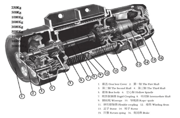 CD1型電動葫蘆主要結(jié)構(gòu):減速器,運行機構(gòu),卷筒裝置,吊鉤裝置,聯(lián)軸器,軟纜電流引入 器,限位器.電機采用錐形轉(zhuǎn)子電動機,集動力與制動力于一體.